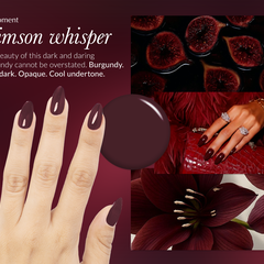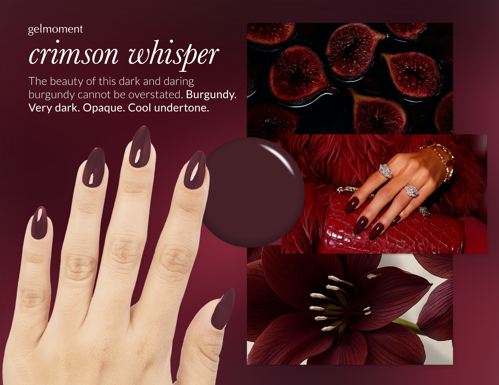 The beauty of this dark and daring burgundy cannot be overstated.Burgundy. Very dark. Opaque. Cool undertone.